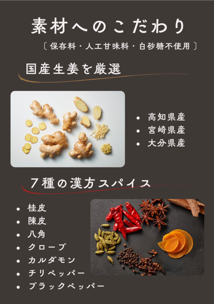 白砂糖や人工甘味料・添加物などを一切使用せず、生姜とスパイス本来の風味を活かしています。
